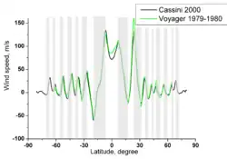 The Jovian bands are bounded by zonal atmospheric flows (winds), called jets. The eastward (prograde) jets are found at the transition from zones to belts (going away from the equator), whereas westward (retrograde) jets mark the transition from belts to zones.[5] Such flow velocity patterns mean that the jets' eastward momentum decreases in belts and increases in zones from the equator to the pole. Therefore, wind shear in belts is cyclonic, while in zones it is anticyclonic.[23] The EZ is an exception to this rule, showing a strong eastward (prograde) jet and has a local minimum of the wind speed exactly at the equator. The jet speeds are high on Jupiter, reaching more than 100 m/s.[5] These speeds correspond to ammonia clouds located in the pressure range 0.7–1 bar. The prograde jets are generally more powerful than the retrograde jets.[5] The jets extend thousands of kilometers into the interior, as measured by the gravitometer instrument onboard of the Juno spacecraft.[33] The direction at which the jets extend into the planet is parallel to Jupiter's axis of rotation[34] rather than in a radial direction (toward the center of the planet), consistent with the Taylor-Proudman theorem.[35] The Galileo Probe measured the vertical profile of a jet along its descent trajectory into Jupiter's atmosphere, finding the winds to decay over two to three scale heights[a] above the clouds, while below the cloud level, winds increase slightly and then remain constant down to at least 22 bar—the maximum operational depth reached by the probe.[18]