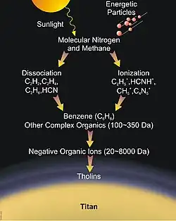 - ↑ Waite, J. H.; et al. (2007). "The Process of Tholin Formation in Titan's Upper Atmosphere". Science. 316 (5826): 870–5. Bibcode:2007Sci...316..870W. doi:10.1126/science.1139727. PMID 17495166. S2CID 25984655.