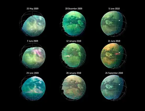 - ↑ McCartney, Gretchen; Brown, Dwayne; Wendel, JoAnna; Bauer, Markus (24 September 2018). "Dust Storms on Titan Spotted for the First Time". NASA. Retrieved 24 September 2018.