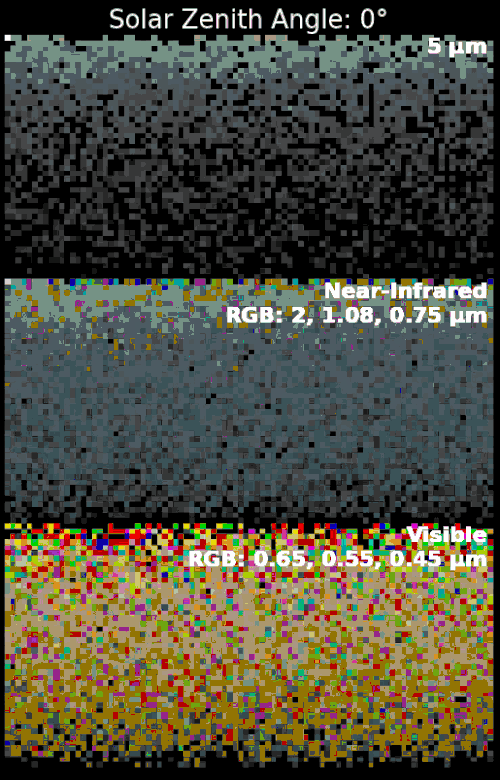 In near-infrared light, the sunsets resemble a Martian sunset or dusty desert sunset.[55] Mie scattering has a weaker influence at longer infrared wavelengths, allowing for more colorful and variable sky conditions. During the daytime, the Sun has a noticeable solar corona that transitions color from white to "red" over the afternoon.[55] The afternoon sky brightness is ~100 times dimmer than Earth.[55] As evening time approaches, the Sun is expected to disappear fairly close to the horizon. Titan's atmospheric optical depth is the lowest at 5 microns.[56] So, the Sun at 5 microns may even be visible when it is below the horizon due to atmospheric refraction. Similar to images of Martian sunsets from Mars rovers, a fan-like corona is seen to develop above the Sun due to scattering from haze or dust at high-altitudes.[55]