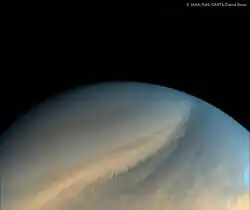 Images from the Akatsuki orbiter revealed something similar to jet stream winds in the low and middle cloud region, which extends from 45 to 60 km in altitude. The wind speed maximized near the equator. In September 2017, JAXA scientists named this phenomenon "Venusian equatorial jet".[42]