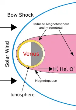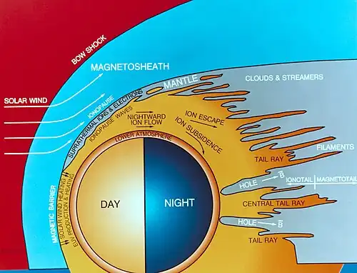 At the subsolar point the bow shock stands 1900 km (0.3 Rv, where Rv is the radius of Venus) above the surface of Venus. This distance was measured in 2007 near the solar activity minimum.[47] Near the solar activity maximum it can be several times further from the planet.[46] The magnetopause is located at the altitude of 300 km.[47] The upper boundary of the ionosphere (ionopause) is near 250 km. Between the magnetopause and ionopause there exists a magnetic barrier—a local enhancement of the magnetic field, which prevents the solar plasma from penetrating deeper into the Venusian atmosphere, at least near solar activity minimum. The magnetic field in the barrier reaches up to 40 nT.[47] The magnetotail continues up to ten radii from the planet. It is the most active part of the Venusian magnetosphere. There are reconnection events and particle acceleration in the tail. The energies of electrons and ions in the magnetotail are around 100 and 1000 eV respectively.[49]