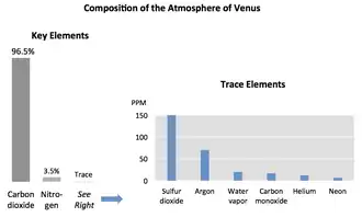 Composition of the atmosphere of Venus. The chart on the right is an expanded view of the trace elements that all together do not even make up a tenth of a percent.