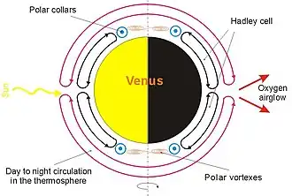 All winds on Venus are ultimately driven by convection.[3] Hot air rises in the equatorial zone, where solar heating is concentrated and flows to the poles. Such an almost-planetwide overturning of the troposphere is called Hadley circulation.[3] However, the meridional air motions are much slower than zonal winds. The poleward limit of the planet-wide Hadley cell on Venus is near ±60° latitudes.[3] Here air starts to descend and returns to the equator below the clouds. This interpretation is supported by the distribution of the carbon monoxide, which is also concentrated in the vicinity of ±60° latitudes.[3] Poleward of the Hadley cell a different pattern of circulation is observed. In the latitude range 60°–70° cold polar collars exist.[3][6] They are characterized by temperatures about 30–40 K lower than in the upper troposphere at nearby latitudes.[6] The lower temperature is probably caused by the upwelling of the air in them and by the resulting adiabatic cooling.[6] Such an interpretation is supported by the denser and higher clouds in the collars. The clouds lie at 70–72 km altitude in the collars—about 5 km higher than at the poles and low latitudes.[3] A connection may exist between the cold collars and high-speed midlatitude jets in which winds blow as fast as 140 m/s. Such jets are a natural consequence of the Hadley-type circulation and should exist on Venus between 55 and 60° latitude.[38]