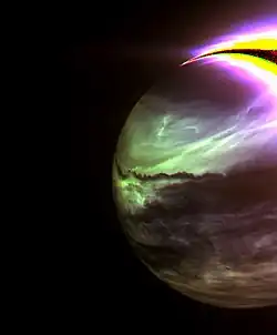 44. 1 2 Drossart, P.; Piccioni, G.; Gerard, G.C.; Lopez-Valverde, M. A.; Sanchez-Lavega, A.; Zasova, L.; Hueso, R.; Taylor, F. W.; et al. (2007). "A dynamic upper atmosphere of Venus as revealed by VIRTIS on Venus Express". Nature. 450 (7170): 641–645. Bibcode:2007Natur.450..641D. doi:10.1038/nature06140. hdl:2268/29723. PMID 18046396. S2CID 4344611.