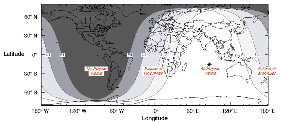 The eclipse was completely visible over east Africa, Asia, and Australia, seen rising over much of Africa and Europe and setting over the central Pacific Ocean.[3]