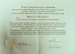 In 1945, the Prague collections of the Nostitz family, along with the autograph of De revolutionibus, were nationalized.[20] Eleven years later, on 5 July 1956, the government of Czechoslovakia offered this artifact as a gift to the Polish nation.[20]