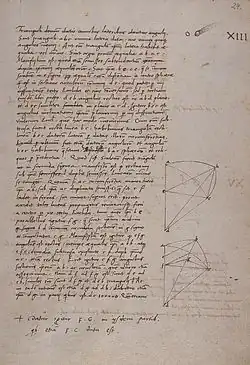 Examiners emphasize that the notation style indicates the writer's preference for order, cleanliness, and harmonious arrangement of text columns and accompanying drawings.[30] Despite the aesthetic form of the manuscript, some strange mistakes were found.[30] Between leaves 125 and 175, Copernicus incorrectly wrote the word iusta instead of iuxta at least six times.[30] This error was described as an interesting case of perpetuating a once-made mistake and unconsciously repeating it.[30]