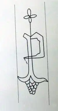 Paper C is the oldest used in the manuscript.[11] Its watermark depicts a rather thick snake, resembling the stance and curvature of a seahorse, with its head bent beyond the axis towards the margin, while its tail points in the opposite direction, although its end is also directed towards the margin.[11] On the snake's head, there is a fleur-de-lis resembling a crown, and a tongue protrudes from its mouth directed upwards and ending in a blade-shaped tip.[11] The snake's body is divided by a dorsal line into two parts, which are further divided into segments by oblique horizontal lines descending downwards.[11] In Charles Briquet's catalogue, the most similar watermark is cataloged as number 10,738.[13][14]