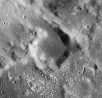 ![]() Lunar Orbiter 4 image (blemish south of crater is present on original photo) | |