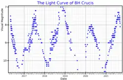 Ronald G. Welch discovered the star while looking for new variables in October 1969. In the first thirty years since discovery, it has become redder and brighter (mean magnitude changing from 8.047 to 7.762) and its period lengthened by 25% from 421 to 530 days.[10] Retrospective examination of photographic plates taken in South West Africa in 1937 and 1951 and stored at Sonneberg Observatory suggest the amplitude of variation might have been smaller in the earliest records.[11] A study of the star published in 2011 found that the increase in period appeared to have stopped or even begun reversing (estimated at 524 days in 2011), and that the spectral class had changed from SC to C, with carbon emission becoming more prominent. Technetium was also recorded in the emission spectrum and its surface temperature deemed to have cooled to 3000 K.[4] Unusually for a Mira variable, BH Crucis had a double maximum, with two peaks in brightness, reminiscent of an RV Tauri variable. However, with the lengthening of its period, this feature disappeared.[10]