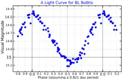 BL Boötis has been designated the prototype of a rare class of variable star known as an anomalous Cepheid or BL Boötis variable.[9] These stars are somewhat similar to Cepheid variables, but they do not have the same relationship between their period and luminosity. Their periods are similar to the ab subtypes of RR Lyrae variables; however, they are far brighter than these stars. Anomalous Cepheids are metal poor and have masses not much larger than the Sun's, on average, 1.5 solar masses.[9] The origin of these stars is uncertain, but thought to possibly be from the merger of two stars.[10] Detailed examination of the spectrum of BL Boötis with the Keck-1 telescope at the W. M. Keck Observatory showed that its effective (surface) temperature is around 6450 K at minimum light. It also showed that the chemical composition was consistent with ageing metal-poor (Population II) stars and hence cast doubt on the origin as a result of a stellar merger. The radial velocity is lower than would be expected if it were from a stellar merger.[6]