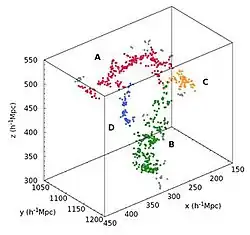 The large complex has a mean redshift of z ~ 0.47 (z times Hubble length ≈ 6.8 billion light years).[1] It consists of two elongated superclusters, two large superclusters, and several smaller superclusters as well.[1] The elongated superclusters form galaxy walls, with the larger of the two having a diameter of 186/h Mpc (supercluster A in the figure); the second wall's being 173/h Mpc (supercluster B). The other two main superclusters are moderately large, having diameters of 91/h Mpc and 64/h Mpc (superclusters D and C, respectively).[1]