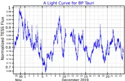 BP Tauri varies in brightness, producing a strong flares due to unsteady accretion[5] held by stellar magnetic field. The lightcurve period is variable from 6.1 to 7.6 days, and quiescent periods without variability are also known.[16]