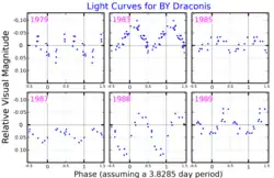 ![]() Visual band light curves for BY Draconis from six different years, adapted from Pettersen et al. (1992)[1] | |
