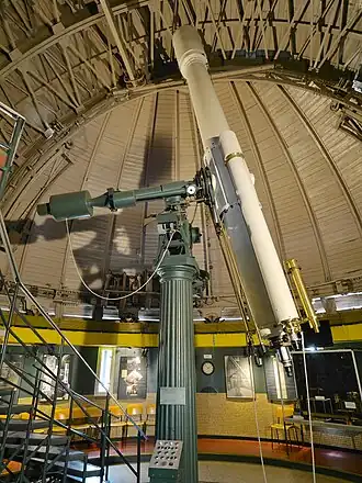 In November 1961, the foundation stone was laid for the Wilhelm Foerster Observatory built with funds from the Deutsche Klassenlotterie Berlin on the Insulaner in Berlin-Schöneberg, which was piled up after the war as a mountain of rubble to a height of a good 78 metres. In 1962, Askania in Berlin-Mariendorf carried out a general overhaul of the telescope, and since the opening of the Wilhelm Foerster Observatory on 30 January 1963, the refractor in the largest dome of the public observatory has been the most important and frequently used instrument for demonstrations by the society.[6] The movable dome with a diameter of eleven metres dates from 1905. It was no longer needed at the Berlin Zeiss-Ikon factories in Berlin-Friedenau and was given to the observatory.