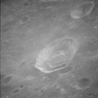 Oblique Apollo 11 image of the interior of Banachiewicz. Banachiewicz B is the larger crater near center, and Knox-Shaw (Banachiewicz F), is in the upper right.