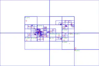 Nodes of the Barnes–Hut tree used for calculating the force acting on a particle at the point of origin.- N-body simulation based on the Barnes–Hut algorithm.