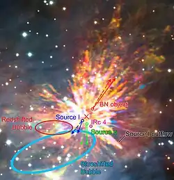 ![]() This image shows the explosion in Orion that likely ejected the stars Becklin–Neugebauer Object, source I and source n. | |