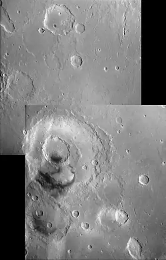 Photographs by the Mars Global Surveyor revealed layered sedimentary rocks in the crater.[2] The layers appear to be only a few meters thick and show little variations in thickness. Recent studies with HiRISE have determined the exact thickness of the layers. The 66 layers measured showed one group of layers to average 3.6 metres (12 ft) and another group to average 36 metres (118 ft) in thickness.[3] Patterns like this are usually produced on Earth through the effects of water; volcanic deposits would not produce ash or laval flows of such regular thickness and in any event, there are no nearby volcanic vents.[4]