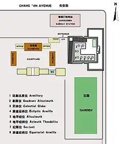 As one of the oldest observatories in the world, the Beijing Ancient Observatory grounds cover an area of 10,000 square meters. The observatory itself is located on a 40 by 40 metres (130 ft × 130 ft) wide platform on the top of a 15 m (49 feet) tall brick tower, an extant portion of the old Ming dynasty era city wall that once encircled Beijing. Several of the bronze astronomical instruments are on the platform, and other armillary spheres, sundials, and other instruments are located nearby at ground level.[1] It is operated as a museum in affiliation with the Beijing Planetarium.