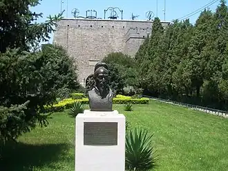![]() On the grounds of the Beijing Ancient Observatory with a bronze bust of the astronomer and mathematician Guo Shoujing in the foreground. | |