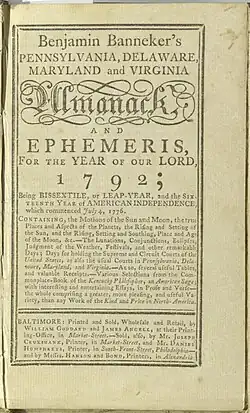 Pemberton then made arrangements for Joseph Crukshank (a Philadelphia Quaker who was a founder of the Pennsylvania Society for the Abolition of Slavery and who had since 1770 been publishing almanacs, including at least one that Waring had calculated) to print Banneker's almanac.[31][52] Having thus secured the support of Pemberton, Rittenhouse and Waring, Banneker delivered a manuscript containing his ephemeris to William Goddard, a Baltimore printer who had published The Pennsylvania, Delaware, Maryland and Virginia Almanack and Ephemeris for every year since 1782.[53] Goddard then agreed to print and distribute Banneker's work within an almanac and ephemeris for the year of 1792.[13]