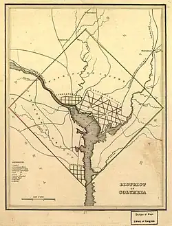 The territory that became the original District of Columbia was formed from land along the Potomac River ceded by the states of Maryland and Virginia to the federal government (see: Founding of Washington, D.C.).[36][37][38] a square to measure 10 miles (16 km) on each side, totaling 100 square miles (260 km2). Ellicott's team placed boundary marker stones at or near every mile point along the borders of the new capital territory.[36][37]