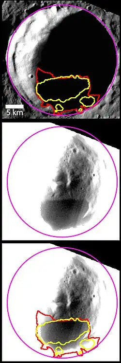 The top image shows a view of Berlioz crater, with the regions that host radar-bright material (yellow) and persistent shadows (red) identified. The middle image was acquired a few hours after the top image, using a longer exposure of the WAC broadband filter, and stretched to reveal the details within the shadowed crater. A distinctively darker region is seen on the crater's floor, which corresponds well with the radar-bright and shadowed regions (bottom image). The darker, low-reflectance material is postulated to be composed of frozen, organic-rich, volatile materials that form through a lag deposit process.[2]