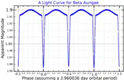 Beta Aurigae is a binary star system, but it appears as a single star in the night sky. The two stars are metallic-lined subgiant stars belonging to the A-type stellar classification;[4] they have roughly the same mass and radius. A-type entities are hot stars that release a blue-white hued light; these two stars burn brighter and with more heat than the Sun, which is a G2-type main sequence star. The pair constitute an eclipsing spectroscopic binary; the combined apparent magnitude varies over a period of 3.96 days between +1.89 and +1.94, as every 47.5 hours one of the stars partially eclipses the other from Earth's perspective.[17] The two stars are designated Aa and Ab in modern catalogues,[18][3] but have also been referred to as components 1 and 2 or A and B.[7][9]