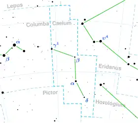 Beta Caeli (β Caeli, abbreviated to β Cae) is a star in the southern constellation of Caelum. It is a dim star but visible to the naked eye, having an apparent visual magnitude of 5.04.[2] Based upon an annual parallax shift of 34.6 mas as seen from Earth,[5] it is located at a distance of 94 light years. The star is moving away from the Sun with a radial velocity of +27.5 km/s.[5]