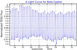 Beta Cephei variables are somewhat evolved stars of masses between about 7 and 20 M (that is, 7–20 times as massive as the Sun). Among their number are some of the brightest stars in the sky, such as Beta Crucis and Beta Centauri; Spica is also classified as a Beta Cephei variable but mysteriously stopped pulsating in 1970.[2] Typically, they change in brightness by 0.01 to 0.3 magnitudes with periods of 0.1 to 0.3 days (2.4–7.2 hours).[2] The prototype of these variable stars, Beta Cephei, shows variation in apparent magnitude from +3.16 to +3.27 with a period of 4.57 hours. The point of maximum brightness occurs when the star is smallest and hottest. Their variation in brightness is much greater—up to 1 magnitude—in ultraviolet wavelengths.[3] A small number of stars have been identified with periods shorter than one hour, corresponding to 1/4 of the fundamental radial pulsation period and 3/8 of the fundamental period. They also have relatively low amplitudes and a very narrow range of spectral types B2-3 IV-V. They are known as the short period group and the GCVS acronym BCEPS.[4][5]