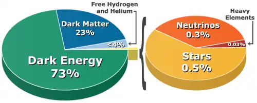 In Big Bang cosmology, the mass–energy density controls the shape and evolution of the universe. By combining astronomical observations with known laws of thermodynamics and particle physics, cosmologists have worked out the components of the density over the lifespan of the universe. In the current universe, luminous matter, the stars, planets, and so on makes up less than 5% of the density. Dark matter accounts for 27% and dark energy the remaining 68%.[22]