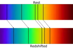 Observations of distant galaxies and quasars show that these objects are redshifted: the light emitted from them has been shifted to longer wavelengths. This can be seen by taking a frequency spectrum of an object and matching the spectroscopic pattern of emission or absorption lines corresponding to atoms of the chemical elements interacting with the light. These redshifts are uniformly isotropic, distributed evenly among the observed objects in all directions. If the redshift is interpreted as a Doppler shift, the recessional velocity of the object can be calculated. For some galaxies, it is possible to estimate distances via the cosmic distance ladder. When the recessional velocities are plotted against these distances, a linear relationship known as Hubble's law is observed:[64] where