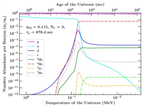 A few minutes into the expansion, when the temperature was about a billion kelvin and the density of matter in the universe was comparable to the current density of Earth's atmosphere, neutrons combined with protons to form the universe's deuterium and helium nuclei in a process called Big Bang nucleosynthesis (BBN).[38] Most protons remained uncombined as hydrogen nuclei.[39]