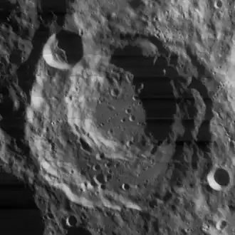 Boussingault is a large lunar impact crater that lies near the rugged southeast limb of the Moon. Because of its location, Boussingault appears highly oblong in shape due to foreshortening. To the southwest is the crater Boguslawsky, and almost attached to the northeast rim is Helmholtz. East-southeast of Boussingault lies the crater Neumayer.