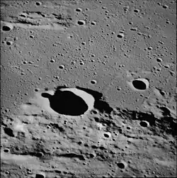 Bowen is a small lunar impact crater that is located to the southwest of the Montes Haemus, on the edge of a small lunar mare named the Lacus Doloris. It was named after American astronomer Ira S. Bowen.[1] It is distinguished only by having a relatively flat floor, rather than being bowl-shaped like most small craters. Bowen was previously designated Manilius A. The crater Manilius is located to the south, at the opposite shore of the Lacus.