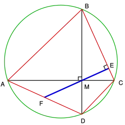 12.30–31. Imaging two triangles within [a cyclic quadrilateral] with unequal sides, the two diagonals are the two bases. Their two segments are separately the upper and lower segments [formed] at the intersection of the diagonals. The two [lower segments] of the two diagonals are two sides in a triangle; the base [of the quadrilateral is the base of the triangle]. Its perpendicular is the lower portion of the [central] perpendicular; the upper portion of the [central] perpendicular is half of the sum of the [sides] perpendiculars diminished by the lower [portion of the central perpendicular].[23]