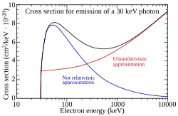 where is the atomic number, the fine-structure constant, the reduced Planck constant and the speed of light. The kinetic energy of the electron in the initial and final state is connected to its total energy or its momenta via where is the mass of an electron. Conservation of energy gives where is the photon energy. The directions of the emitted photon and the scattered electron are given by where is the momentum of the photon.