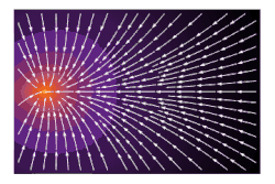 Field lines and modulus of the electric field generated by a (negative) charge first moving at a constant speed and then stopping quickly to show the generated Bremsstrahlung radiation.
