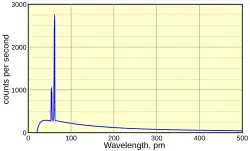 Spectrum of the X-rays emitted by an X-ray tube with a rhodium target, operated at 60 kV. The continuous curve is due to bremsstrahlung, and the spikes are characteristic K lines for rhodium. The curve goes to zero at 21 pm in agreement with the Duane–Hunt law, as described in the text.