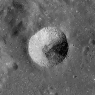 Brewster is a small lunar impact crater in the northern fringes of Sinus Amoris. It was named after the Scottish scientist, Sir David Brewster.[1] Its diameter is 9.8 km.[1] It lies to the southwest of the larger crater Römer. To the southeast of Brewster is the similar-sized Franck. This crater is cup-shaped and symmetrical, with no overlapping craters of note. A low ridge is attached to the northern rim. The crater interior has a relatively high interior albedo compared to the surrounding terrain.