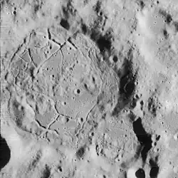 This crater has become considerably worn and eroded by subsequent impacts, leaving a formation that has been described as disintegrated. The most intact portion of the rim is along the northeastern side. There is a smaller, crater-like formation intruding into the southeastern rim. Within the crater, the floor is pitted by tiny impacts, and has a fracture system[1] of criss-crossing clefts near the northern and southern rims. There is a low ridge near the southwest corner of the interior.