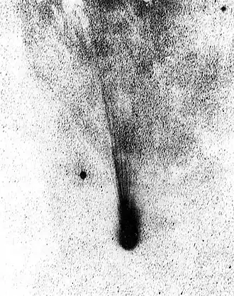 Comet Levy was observed by Hubble Space Telescope (HST) on 27 September 1990, about 5 months after its launch. As the tracking of Solar System objects had not yet been developed, HST obtained only short exposures of the comet with the Wide Field Camera.[8] Two 4 seconds exposures with a red broadband filter were obtained 6.5 hours apart. The coma was found to be brighter at the sunward side than the tailward, indicating that sublimation takes place primarily at the dayside of the nucleus. An arc of dust was found to expand in the coma, with the creation of such arcs probably resulting in the observed periodic brightness changes of the comet. No jets could be confidently observed.[8]