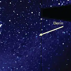 Comet C/2010 X1 (Elenin) is an Oort cloud comet discovered by Russian amateur astronomer Leonid Elenin on December 10, 2010, through remote control of the International Scientific Optical Network's robotic observatory near Mayhill in the U.S. state of New Mexico. The discovery was made using the automated asteroids discovery program CoLiTec.[5] At the time of discovery, the comet had an apparent magnitude of 19.5,[2] which made it about 150,000 times fainter than can be seen with the naked eye.[6] The discoverer, Leonid Elenin, originally estimated that the comet nucleus was 3–4 km in diameter,[7] but more recent estimates place the pre-breakup size of the comet at 2 km.[8] Comet Elenin started disintegrating in August 2011,[9] and as of mid-October 2011 was not visible even using large ground-based telescopes.[10]
