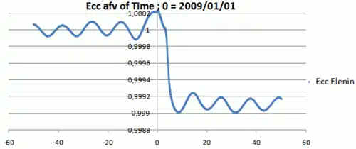 Before entering the planetary region (epoch 1800), Elenin had a calculated barycentric orbital period of tens of millions of years with an apoapsis (aphelion) distance of about 97,000 AU (1.53 ly).[4] Elenin was probably in the outer Oort cloud with a loosely bound chaotic orbit that was easily perturbed by passing stars.
