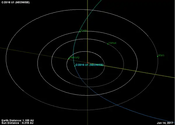 C/2016 U1 (NEOWISE) is a hyperbolic comet discovered 21 October 2016 by NEOWISE, the asteroid-and-comet-hunting portion of the Wide-Field Infrared Survey Explorer (WISE) mission.[1][2][3] The comet brightened to magnitude +6.8[4] and could be observed with binoculars,[5] during the first week of 2017 and it was closest to the Sun on 14 January 2017.[2][6]