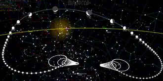 ![]() Path of the comet C/2018 V1 across the sky, with a 7-day motion shown | |