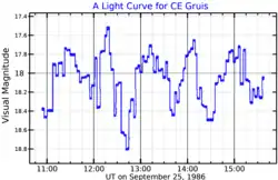 CE Gruis is a faint binary star system in the constellation Grus. It is a variable star, with a B-band brightness that ranges from a peak magnitude of 17.4 down to a minimum of 19.5[6] over a period of 108.6 minutes.[7] The system is composed of a white dwarf and donor star, locked into a close, synchronous orbit. In such systems, known as polars, material from the donor star does not form an accretion disc around the white dwarf because of its intense magnetic field, but rather streams directly onto it along columns.[4]