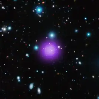 - ↑ Wang, Tao; Elbaz, David; Daddi, Emanuele; Finoguenov, Alexis; Liu, Daizhong; Schrieber, Corenin; Martin, Sergio; Strazzullo, Veronica; Valentino, Francesco; van Der Burg, Remco; Zanella, Anita; Cisela, Laure; Gobat, Raphael; Le Brun, Amandine; Pannella, Maurilio; Sargent, Mark; Shu, Xinwen; Tan, Qinghua; Cappelluti, Nico; Li, Xanxia (2016). "Discovery of a galaxy cluster with a violently starbursting core at z=2.506". The Astrophysical Journal. 828 (1): 56. arXiv:1604.07404. Bibcode:2016ApJ...828...56W. doi:10.3847/0004-637X/828/1/56. S2CID 8771287.